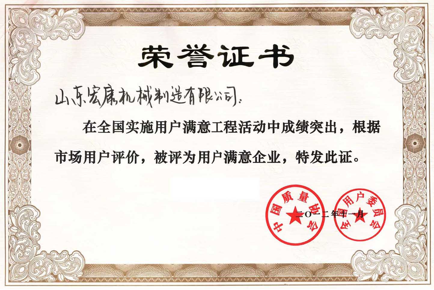 中國質量協會榮譽證書