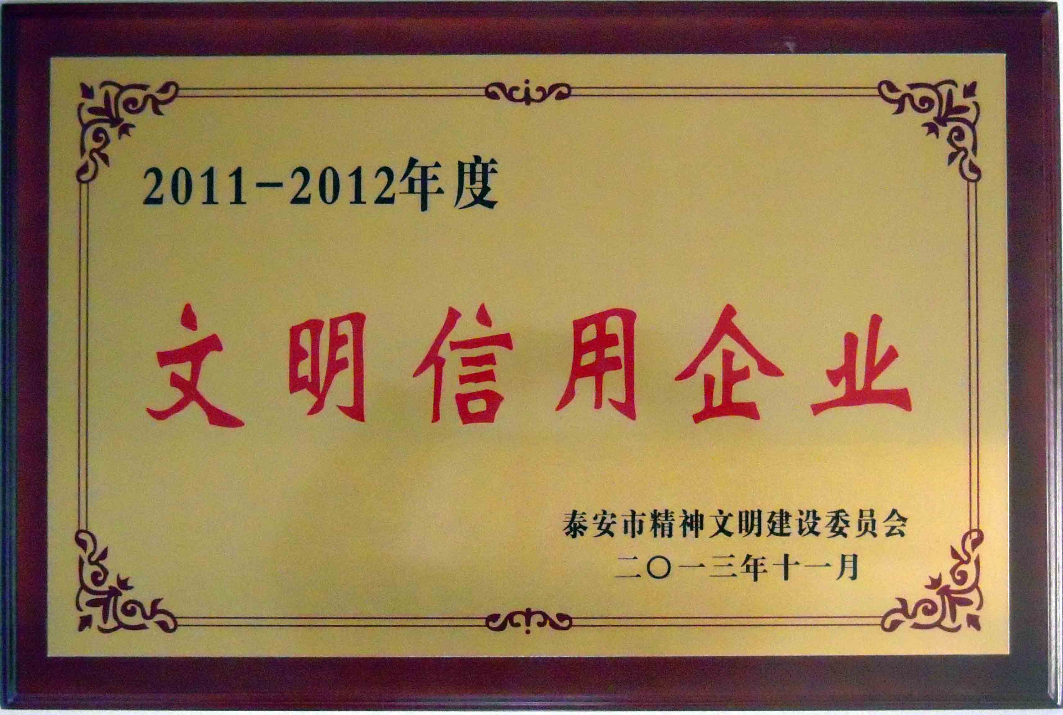 根據泰安市精神文(wén)明委員(yuán)會(huì)下發《關於命名(míng)2011-2012年度泰安市文明誠信金融單位、文明信用(yòng)鄉鎮、文明信用企業的決定》(泰文明委【2013】10號),集團公司被授(shòu)予“泰安市文明信用企業”稱號。