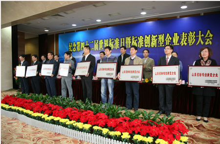10月14日,山東省質量技術監督局、山東省經濟和信息化(huà)委員(yuán)會在濟南舜耕(gēng)山莊聯(lián)合舉(jǔ)行紀念(niàn)第42屆世界標準日暨全省標準創新型(xíng)企業表彰大會,共(gòng)同慶祝第42屆世界標準日的到來,並對評選出的山東省首屆標準創新型企業進行表彰。受董事長、總經理康(kāng)鳳明委托,集團常務副總經理潘憲平參加了此次表彰大會並上台領取“山東省標準(zhǔn)創新型(xíng)企業”榮譽牌匾(biǎn)。